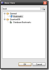 To add a Bookmark chose the code fragment you want to bookmark and from Edit menu select Add Bookmark. Once the bookmark is added there will be a small blue rectangle in the left hand side of the code window and a green rectangle in right had side of the code window. To view all the bookmarks that you added you have to bring in the Bookmarks view. Select Window > Show View > Other… from the main menu. Type "bookmark" in the filter box of the Show View Dialog box and select Bookmarks view.